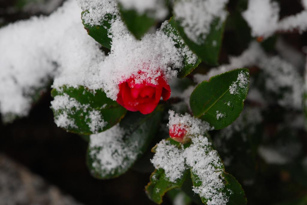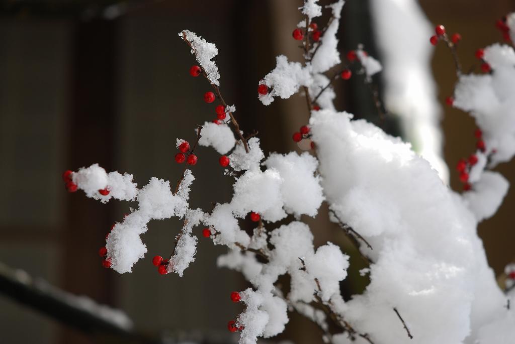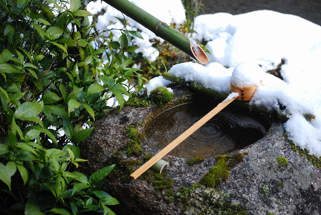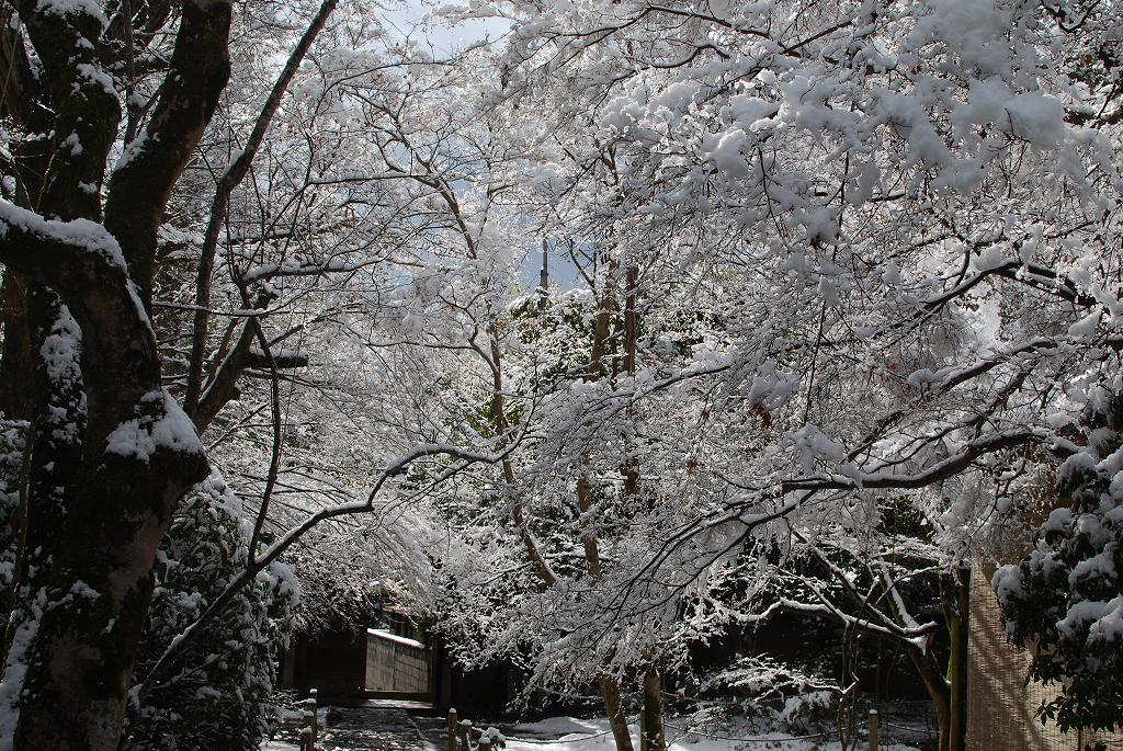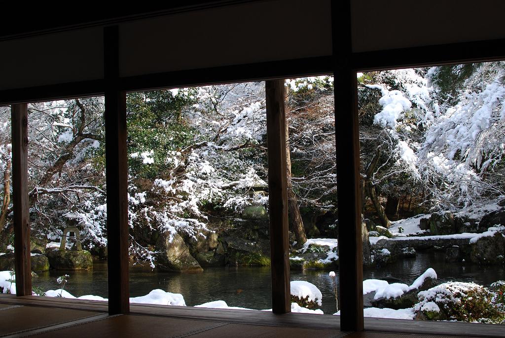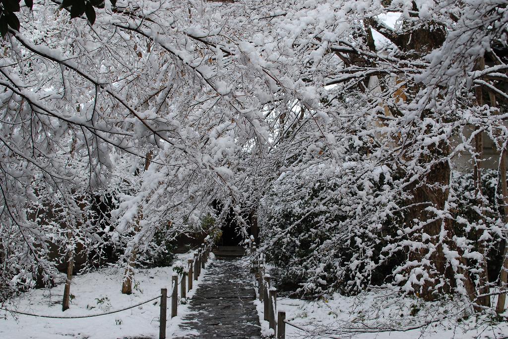 モノクロの雪景色が、簡素な寺の佇まいを際立たせています。