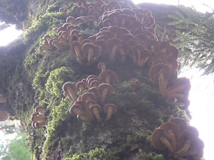 「なめたけ」はたくさんありました。これは、ミズナラの巨木がナラ枯れ病でほとんど枯れてしまったからだそうです。「なめたけ」はミズナラの枯れ木に発生します。また、発芽したミズナラを増えすぎた鹿が食べてしまうので若い木も全く育っていない状態です。おおくのどんぐりを実らせるミズナラの巨木が枯れたことで、美山の生態系のバランスが崩れ、その多様性が失われかけています。